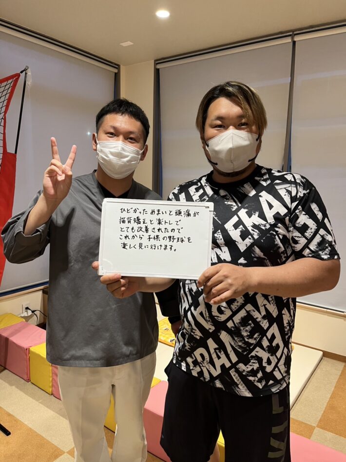 ひどかっためまいと頭痛が 猫背矯正と楽トレでとても改善されたので これkら子供との野球を楽しく見に行けます。